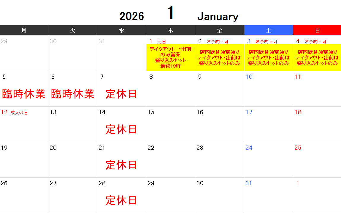 2025.11.23 1月営業カレンダー 元旦はお持ち帰り・出前のみ営業 5日~7日休業